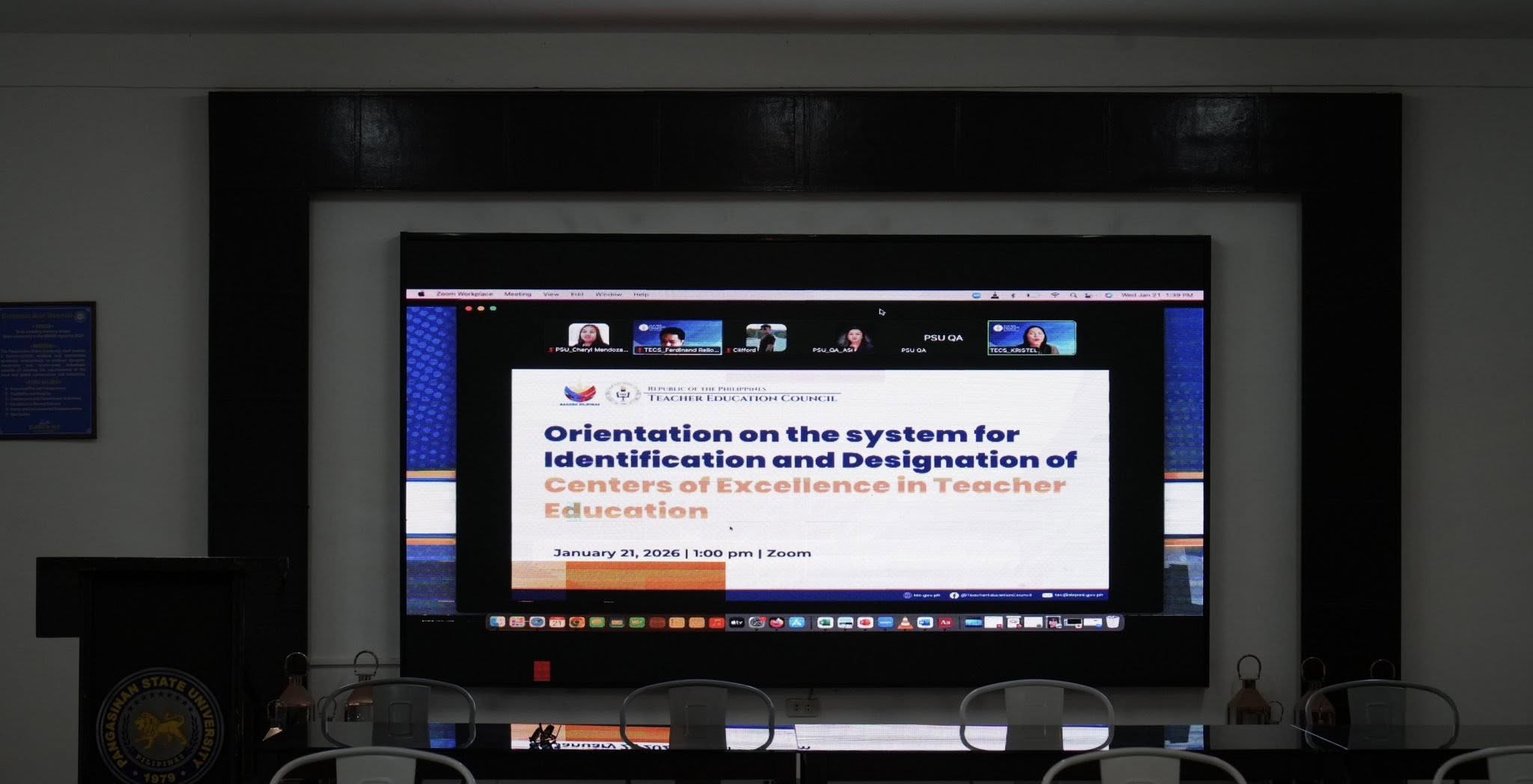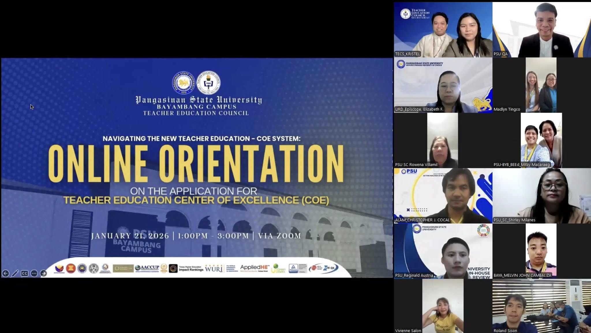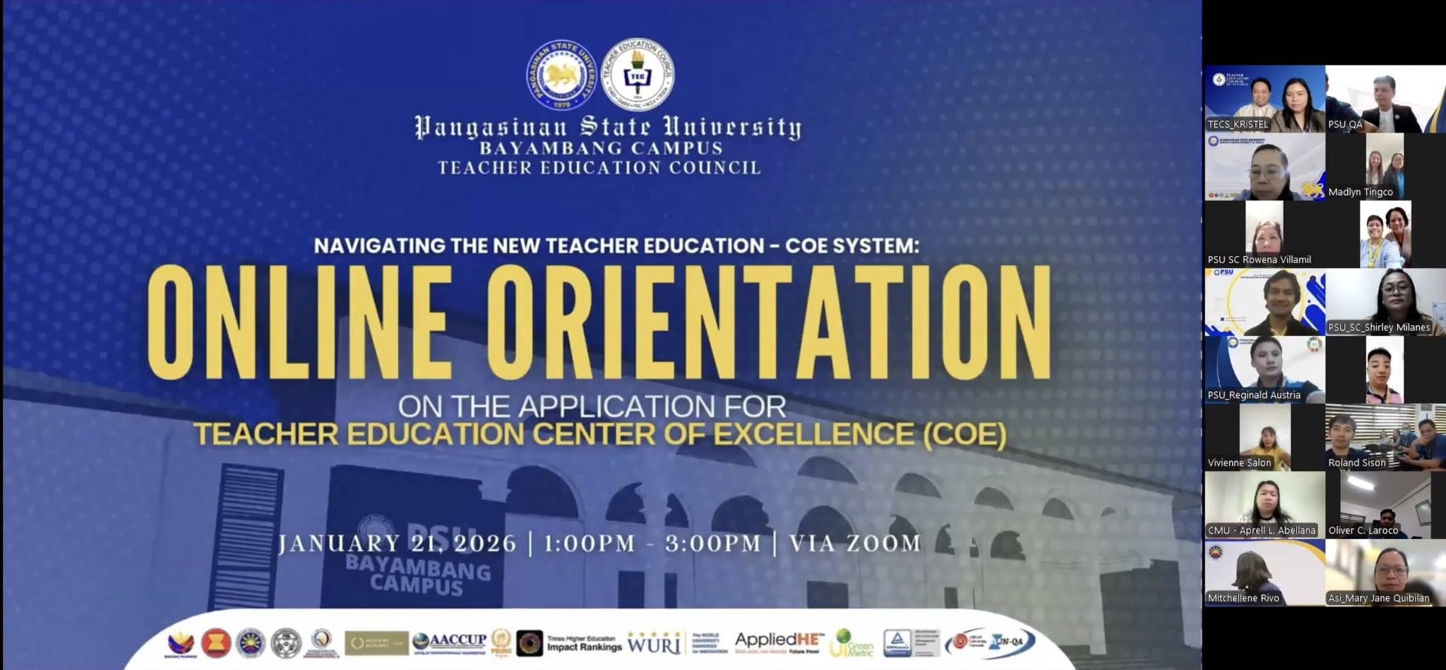 In partnership with the Teacher Education Council (TEC), Pangasinan State University–Bayambang Campus (PSU-BC) hosted the Online Orientation on the Application for Teacher Education Center of Excellence (COE) via Zoom on January 21, 2026, reaffirming its long-standing commitment to quality teacher education.