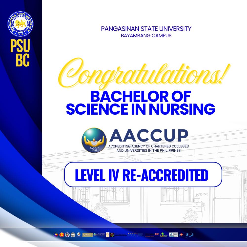 Pangasinan State University – Bayambang Campus (PSU-BC) proudly announces that its Institute of Nursing (IN) has officially been re-accredited with Level IV status by the Accrediting Agency of Chartered Colleges and Universities in the Philippines (AACCUP). The accreditation process was conducted last year, and after three months, the official results were officially released, confirming the Institute’s standing at the highest level of program excellence.